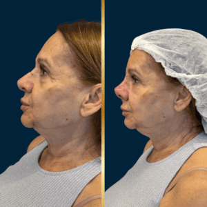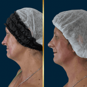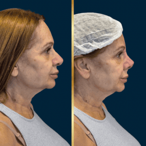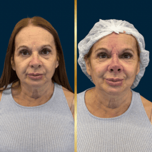 A paciente apresentava ptose de ponta nasal, ângulo nasolabial reduzido e projeção limitada, associados à perda de suporte ligamentar decorrente do envelhecimento. Após a aplicação da técnica, observou-se: